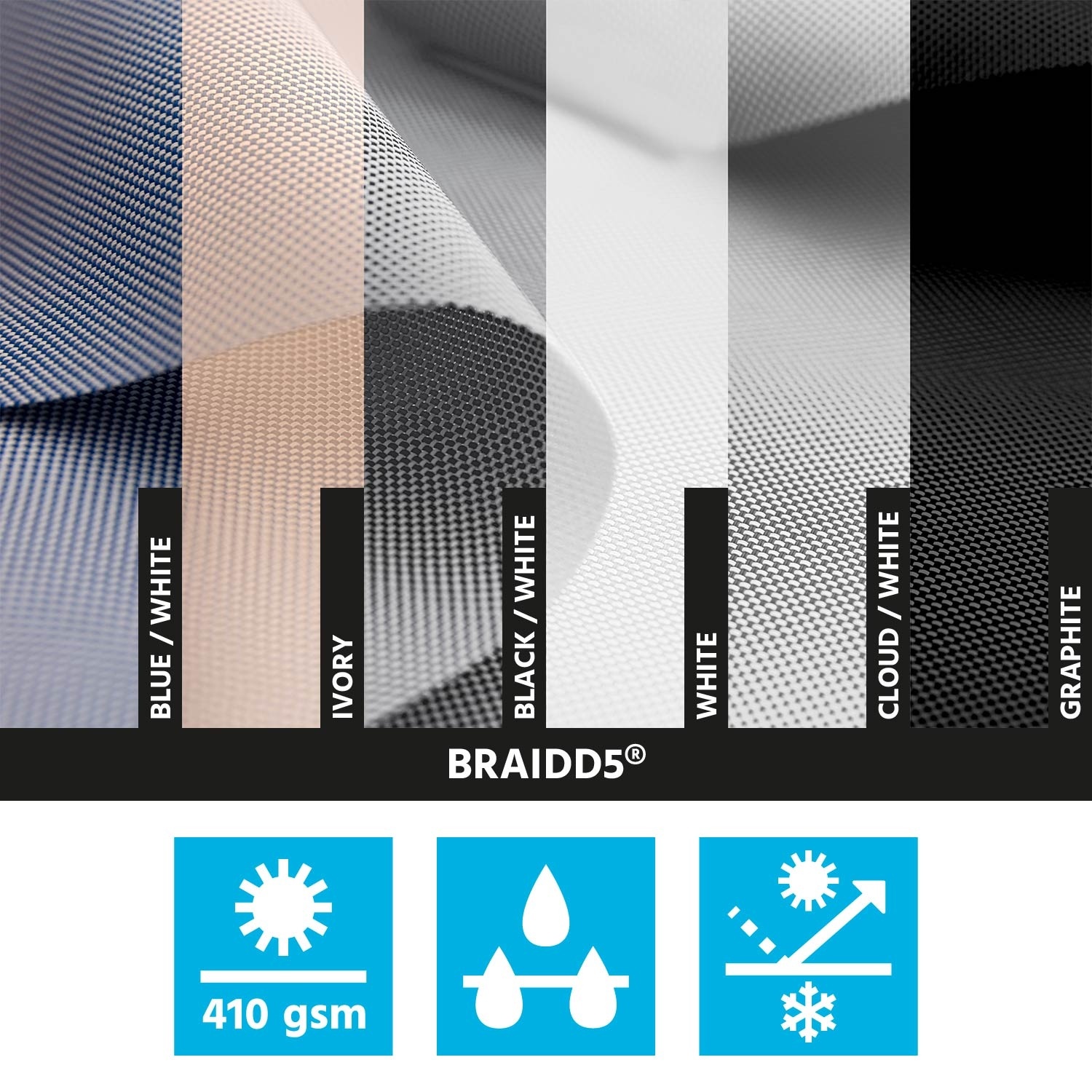 Nasza tkanina techniczna Braidd5® z poliestru i PVC jest idealna dla tych, którzy szukają oddychającego odcienia o eleganckim splocie i wysokiej wytrzymałości.