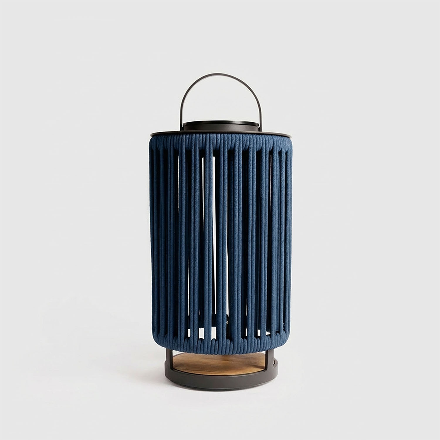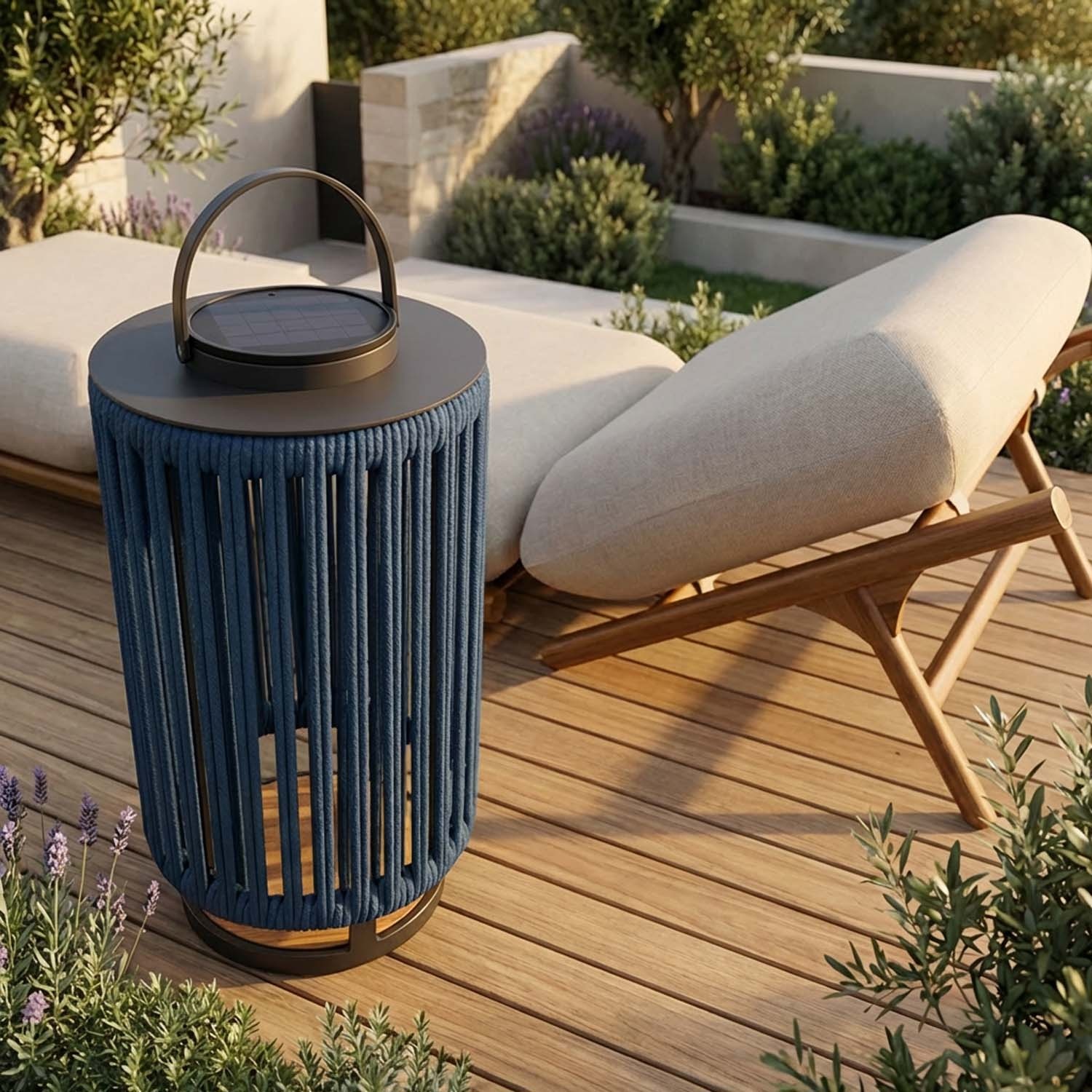 Marinea to przenośna lampa solarna z nylonową plecioną liną w układzie radialnym i podstawą z teaku.