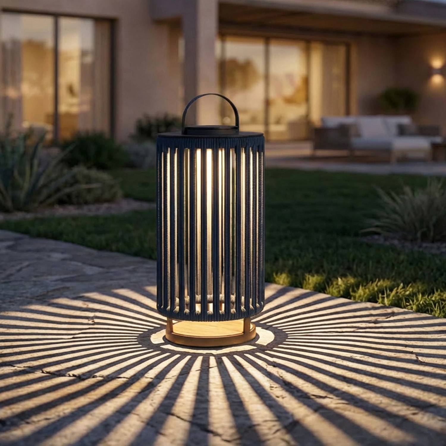 Linka nylonowa jest splatana według precyzyjnego wzoru radialnego. Gdy LED się zapala, każdy promień światła przefiltrowany między linkami rysuje wzór promienisty na otaczających powierzchniach: stole, ścianie, podłodze tarasu. To nie jest przypadkowy efekt. To geometria zastosowana w oświetleniu.