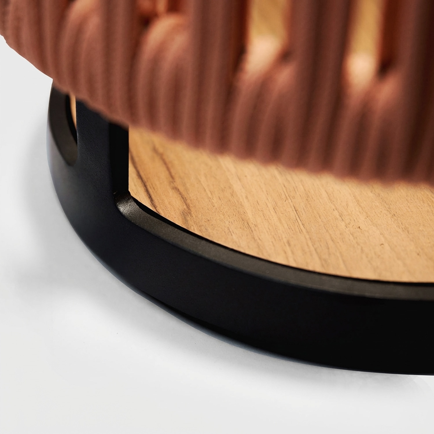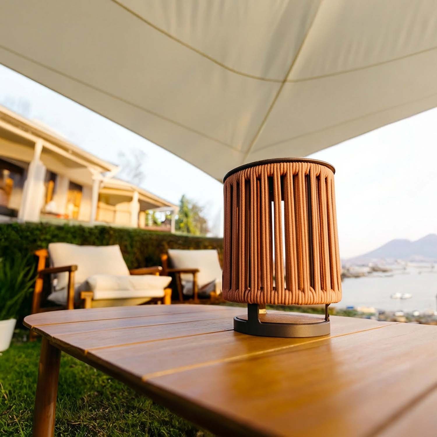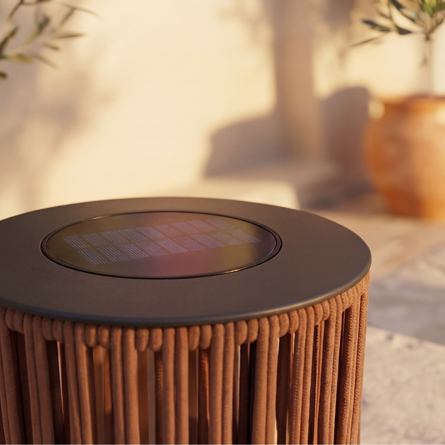Nie ma uchwytu: to świadomy wybór projektowy. Podstawa została zaprojektowana tak, aby pozostać stabilnie na miejscu, wieczór po wieczorze, na schodach, murkach i donicach. Gdy się zapala, lina filtruje światło i rzuca liniowe, rytmiczne pasy cienia na otaczające powierzchnie.