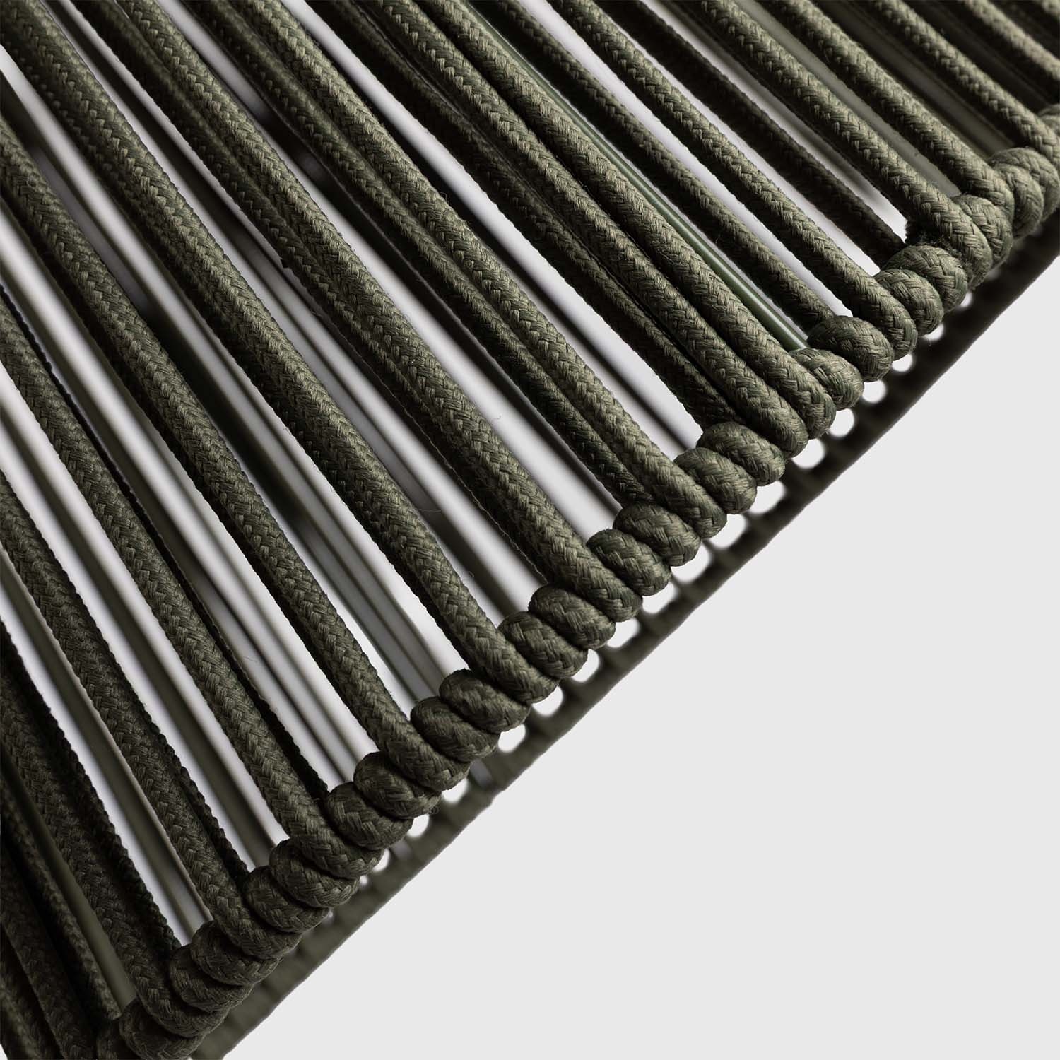 Linka to nie tylko estetyka: wykonana jest z polipropylenu olefin, syntetycznego włókna odpornego na promieniowanie UV, przeciwgrzybicznego, szybko schnącego i w 100% nadającego się do recyklingu. Gdy Ropelle się włącza, pleciona struktura rzuca radialny wzór ciepłych cieni na otaczające powierzchnie. Efekt sceniczny, który dekoruje.