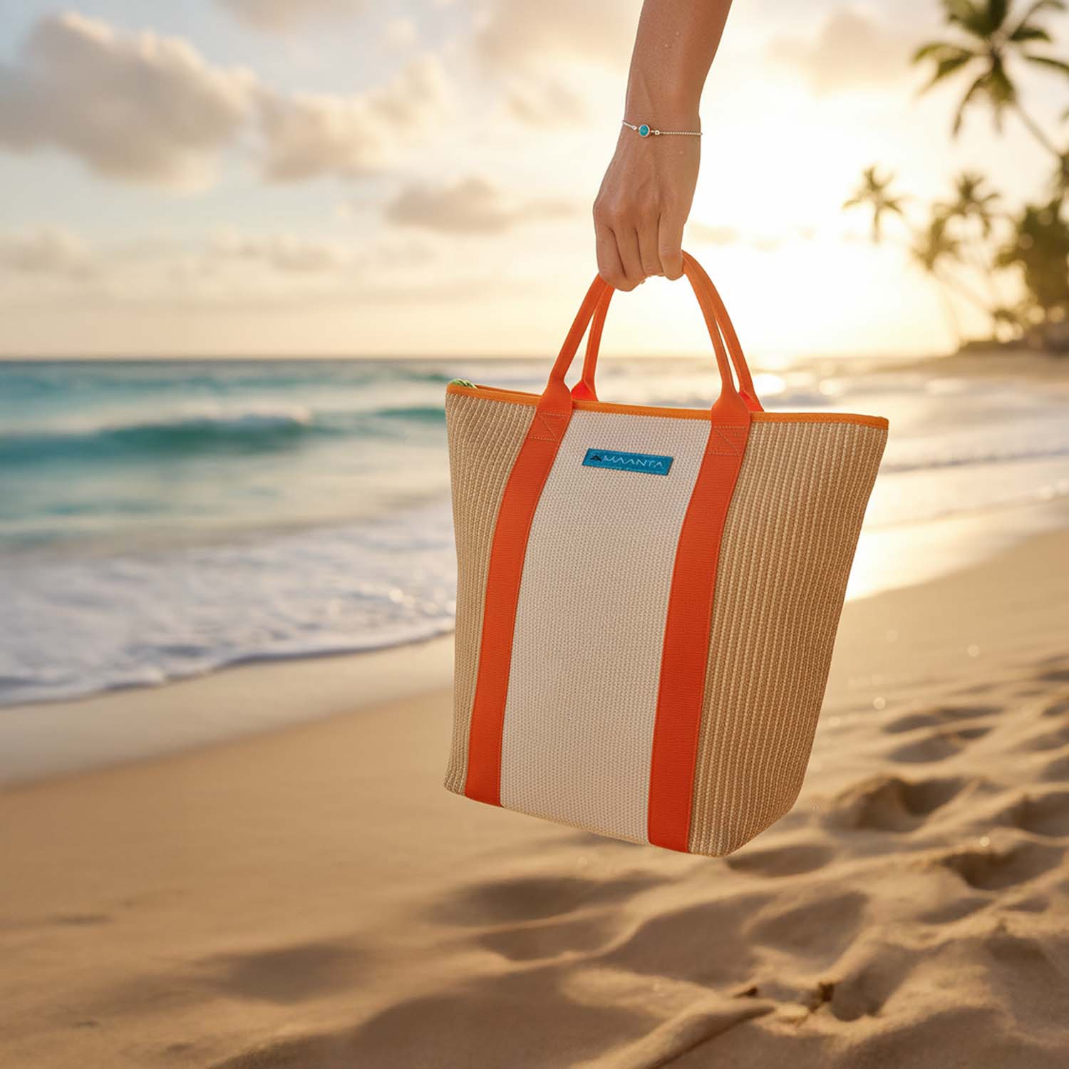 Dwukolorowa torba plażowa z pomarańczowymi wstawkami i zielonymi i niebieskimi detalami, wygodnymi uchwytami z tkaniny, zapięciem na suwak u góry.