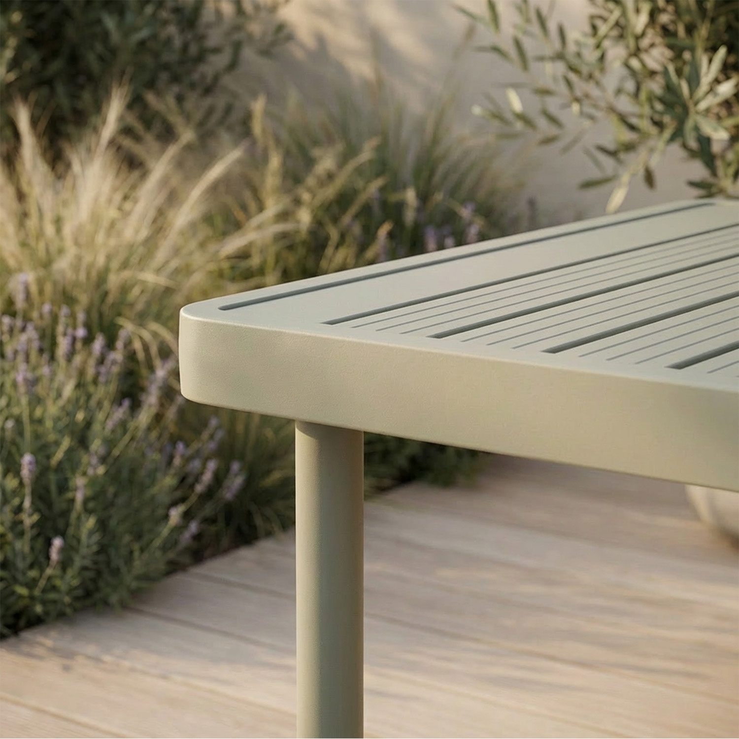 Pod spodem aluminiowa konstrukcja o smukłych i lekkich profilach zapewnia stabilność bez wizualnego ciężaru. Melina nie wygląda jak zestaw outdoorowy ustawiony na tarasie: wygląda jak salon, który postanowił żyć na zewnątrz.