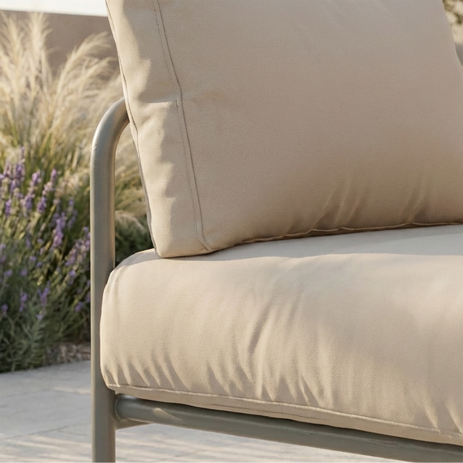 Poduszki są sercem projektu: 16 cm grubości, zaokrąglony profil, pokryte tkaniną Olefin, która odpycha wodę, plamy i promienie UV, nie tracąc miękkości. Wypełnienie o wysokiej gęstości zachowuje kształt i podparcie przez wiele sezonów: trzyma, wspiera, otula.
