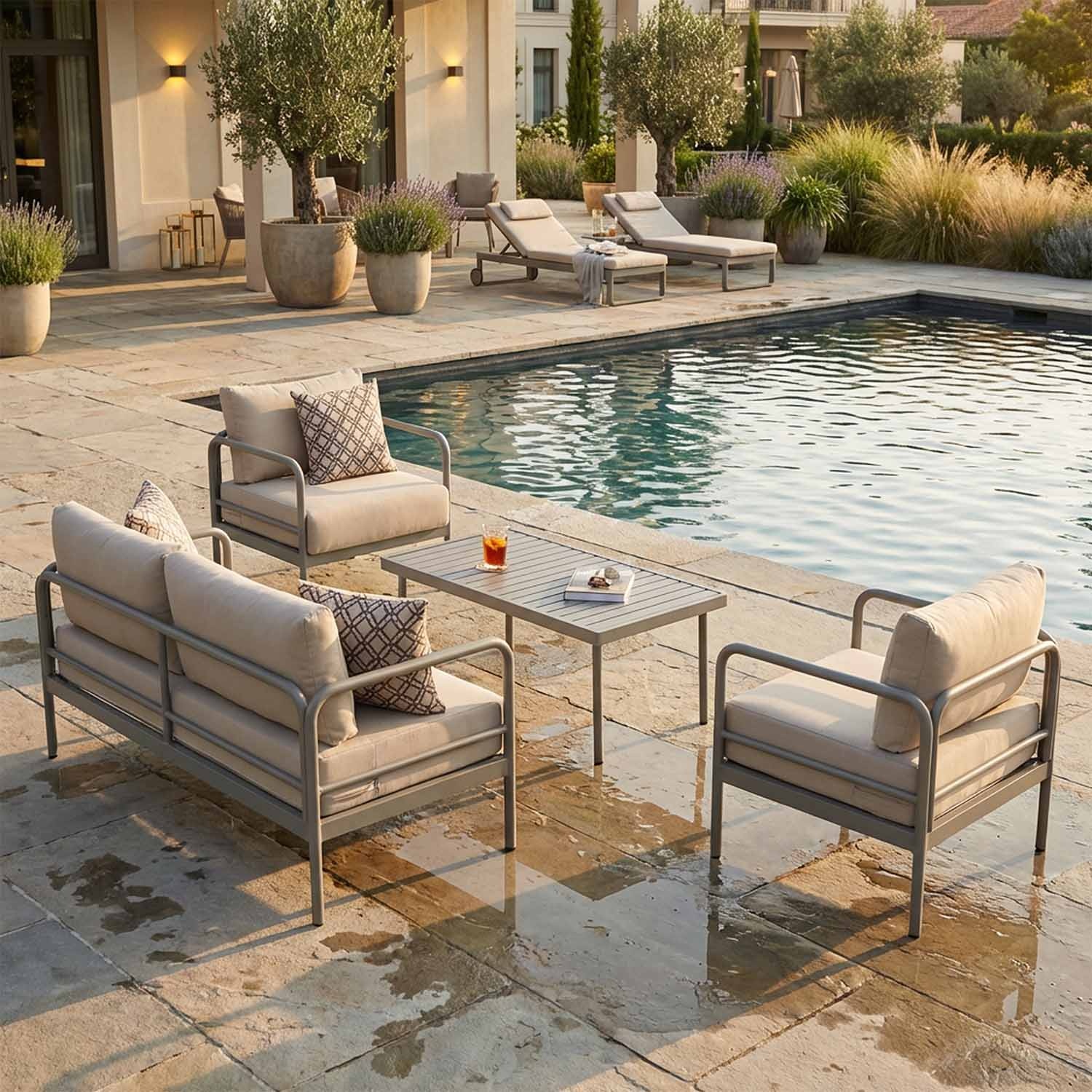 Malowane aluminium i Olefin są odporne na wilgoć, nie tracąc koloru. Odcienie piasku i cappuccino naturalnie współgrają z wodą.