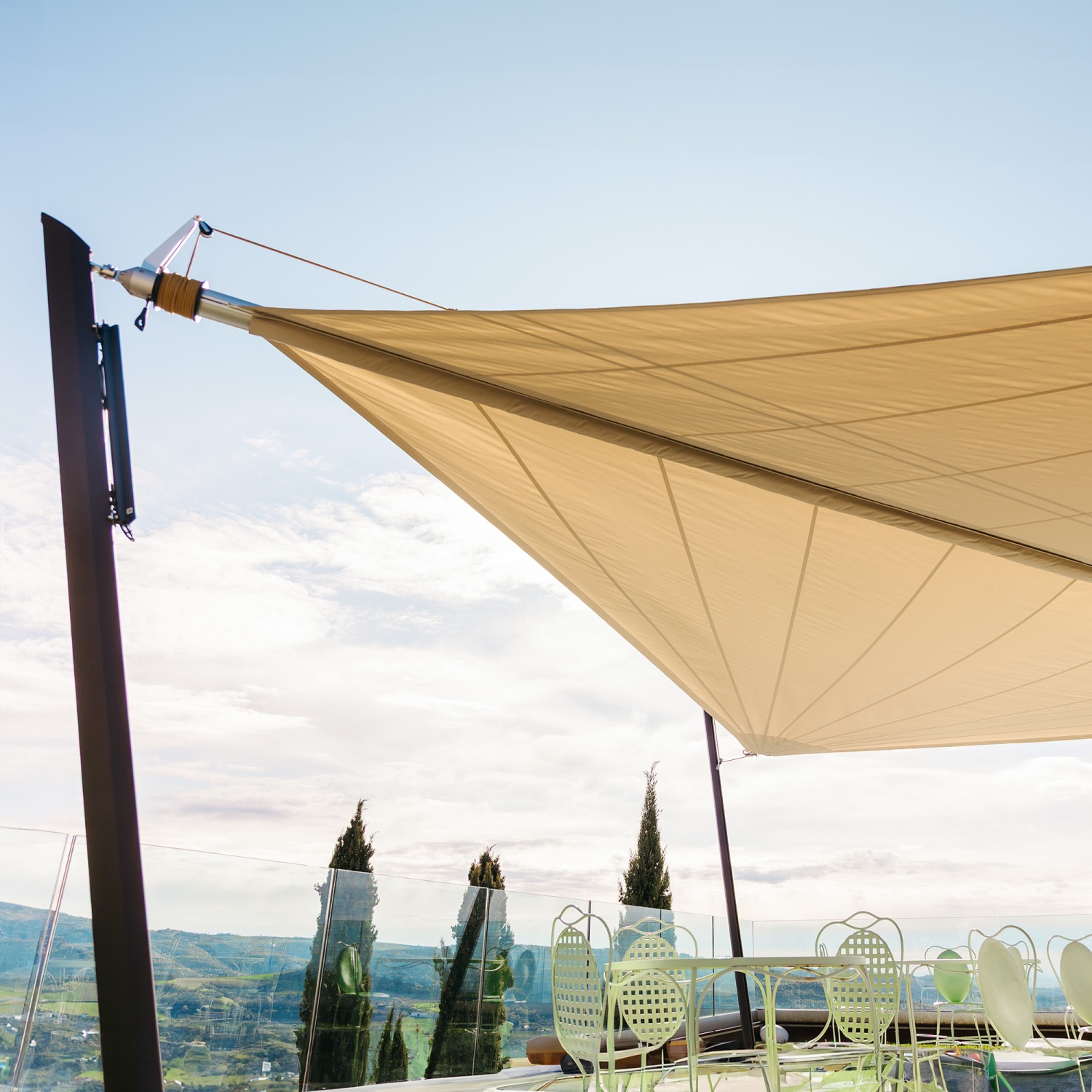 Żagiel przeciwsłoneczny elektryczny Zefira może pozostać zamontowany przez cały rok. Stal nierdzewna i tkanina Purishade® są odporne na deszcz, mróz i trudne warunki atmosferyczne. Maanta tworzy żagle zwijane elektryczne zaprojektowane z myślą o trwałości. Demontaż sezonowy jest zalecany, ale niekonieczny.